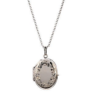 Sterling Silver Engravable Oval Locket. Floral details run along the edge of this oval locket, perfect for engraving your own unique touch in the center. Holds four pictures.
